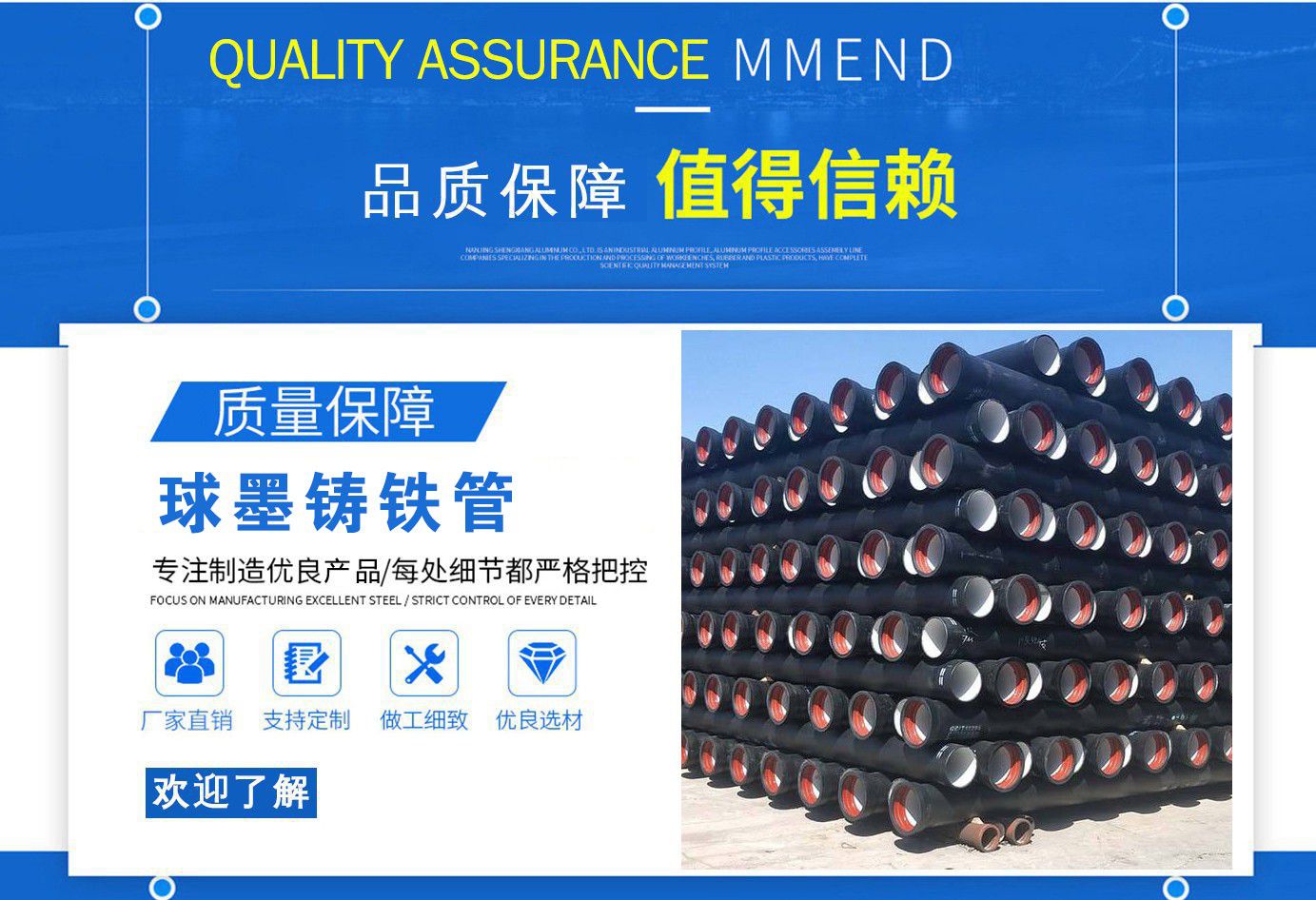 山西飛翔鑄業(yè)有限公司是一家以新興技術(shù)致力于研制開發(fā)、生產(chǎn)、銷售、施工安裝各種球墨管廠家,球墨鑄鐵管價格,國標球墨管,k9球墨鑄鐵管,國標球墨鑄鐵管,離心球墨鑄鐵管等系列鑄鐵產(chǎn)品。公司擁有完善的銷售、售后服務(wù)體系及一支由鑄造專家、工程師組成的精通產(chǎn)品設(shè)備和生產(chǎn)鑄造的技術(shù)力量隊伍。隨著企業(yè)的發(fā)展,我們積累了豐富的鑄造經(jīng)驗與科技水平。使得產(chǎn)品具有高強度、高韌性、耐腐蝕性強等性能。同時,我們獲得質(zhì)量管理體系認證、產(chǎn)品質(zhì)量認證、職業(yè)健康體系認證、環(huán)境管理體系認證。產(chǎn)品暢銷各地并打入韓國、新加坡等東南亞市場。 在未來的發(fā)展中,公司奉行誠信共雙贏,合作創(chuàng)盛世的企業(yè)理念。讓我們一起共創(chuàng)美好未來!  公司產(chǎn)品采用良好的工藝流程,以確保產(chǎn)品質(zhì)量的穩(wěn)定性:以良好的設(shè)備,確保質(zhì)量的可靠性。廣泛應(yīng)用于國內(nèi)外城市的市政建設(shè),通信,自來水,消防,園林,環(huán)保等行業(yè),產(chǎn)品大獲贊譽!  我們有多年的井蓋生產(chǎn)經(jīng)驗,多名老技術(shù)工人有將近二十年的生產(chǎn)經(jīng)驗,還聘請多名新技術(shù)研發(fā)人員,因為我們始終堅信質(zhì)量才是未來生存的根本,只有把質(zhì)量保證了,企業(yè)才會有更加美好的未來。公司堅持用心服務(wù),誠信為本,與時俱進,科技為先的企業(yè)理念,堅持科技先導(dǎo)、竭誠為廣大用戶服務(wù)。歡迎各界朋友蒞臨我公司參觀,指導(dǎo)洽談業(yè)務(wù),相信選擇我們就是選擇我們共贏的明天...